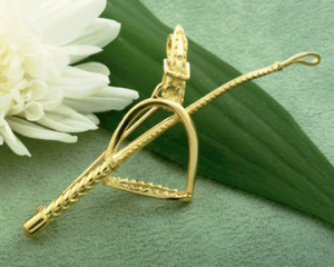 (picture above) Talk about classic equestrian style. Absolutely brilliant high end luxury, this gold horse stock pin is 1 1/4" high and 2" wide. Made in the USA by master goldsmiths, the 18K Gold Crop and Stirrup Pin features some amazing detail work. Check out the textured handle of the riding crop and the stirrup foot pin. You'll treasure this piece of fine horse jewelry for years to come.